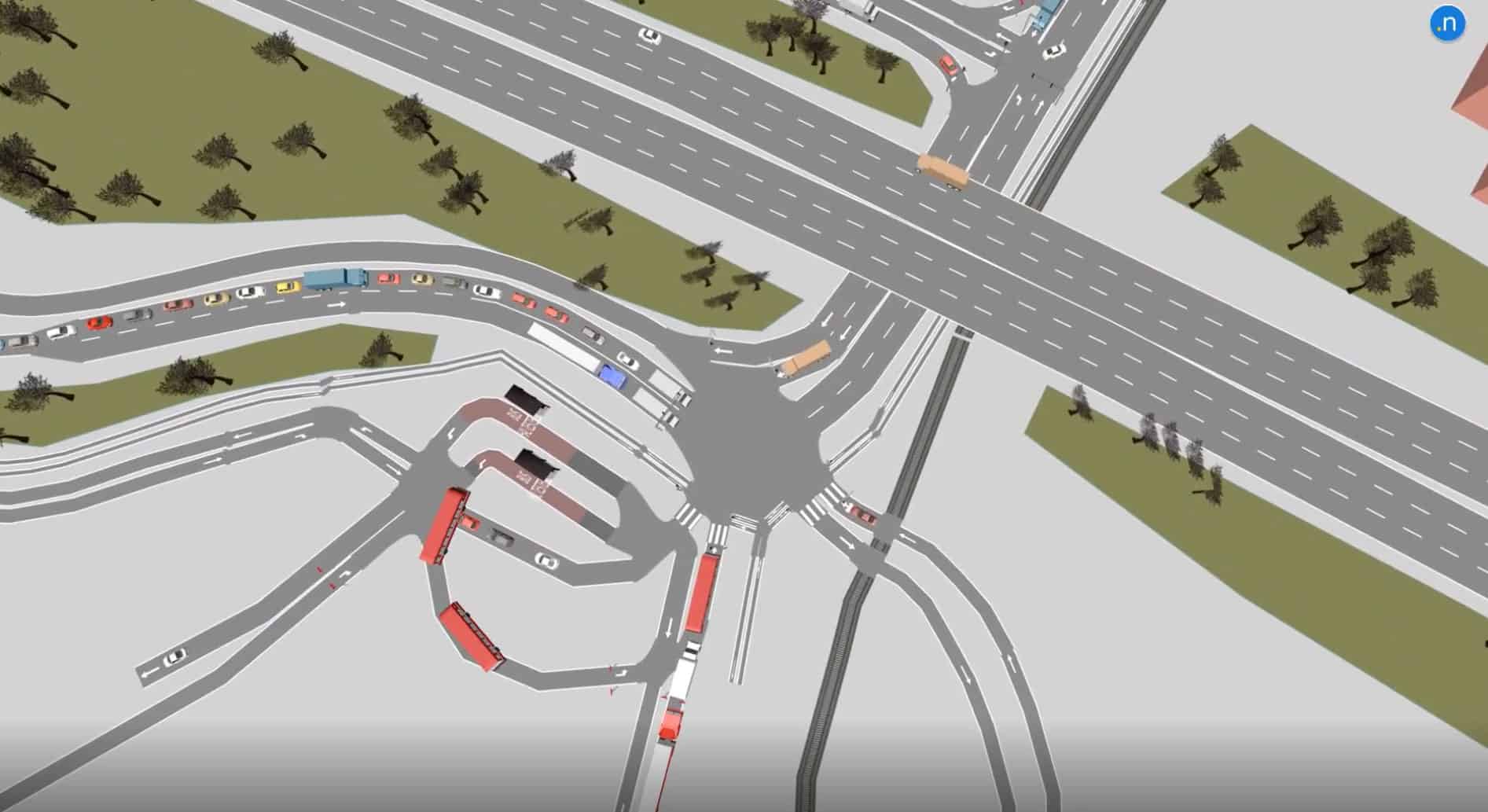 Im Zuge des Projekts ÖVAS wurden leistungssteigernde Umbaumaßnahmen entwickelt. Der westliche Knotenpunkt, bislang als Kreisverkehr ausgeführt, soll zu einem signalgesteuerten Doppelknoten mit zentraler Geh- und Radwegführung umgebaut werden. Der östliche Knotenpunkt soll geometrisch adaptiert und ebenfalls mit einer Verkehrslichtsignalanlage ausgestattet werden. Aufgrund der Nahelage und der Wechselwirkungen der beiden Knotenpunkte war eine detaillierte Analyse mittels mikroskopischer Verkehrsflusssimulation erforderlich, um belastbare Aussagen zu Staulängen, Wartezeiten und Sättigungsgraden treffen zu können.